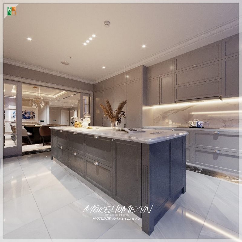 . Phòng ăn của biệt thự được thiết kế theo phong cách hiện đại với bộ bàn ăn độc đáo, bàn đảo bếp và sàn được ốp đá nhân tạo, tạo nên không gian sử dụng bữa ăn sang trọng.
