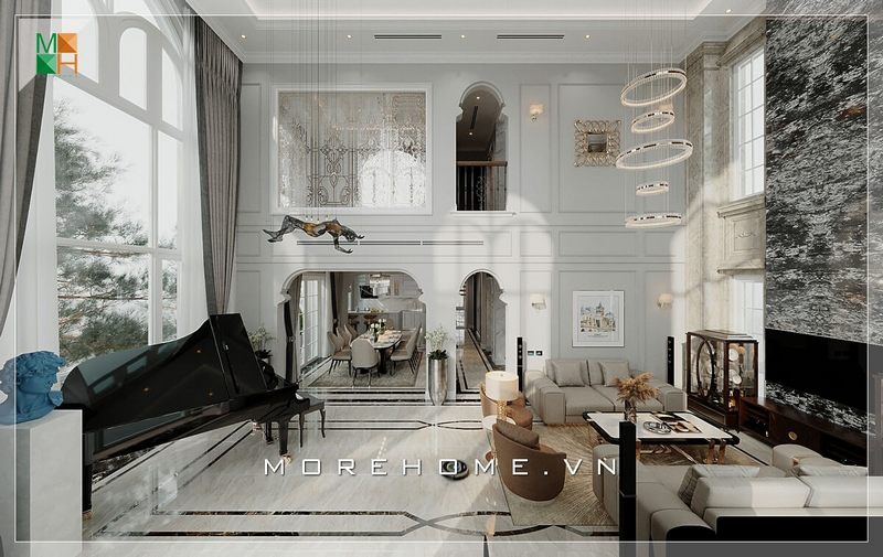 Bên cạnh đó, xu hướng tối giản vẫn tiếp tục chiếm ưu thế, nhưng với một biến thể thú vị: sự kết hợp giữa phong cách tối giản và các yếu tố trang trí cầu kỳ. Điều này không chỉ mang lại vẻ đẹp hiện đại mà còn tạo cảm giác ấm cúng cho biệt thự. Đặc biệt, những bức tranh nghệ thuật lớn hoặc các tác phẩm điêu khắc độc đáo trở thành điểm nhấn chủ đạo, biến không gian sống thành một tác phẩm nghệ thuật thực thụ.